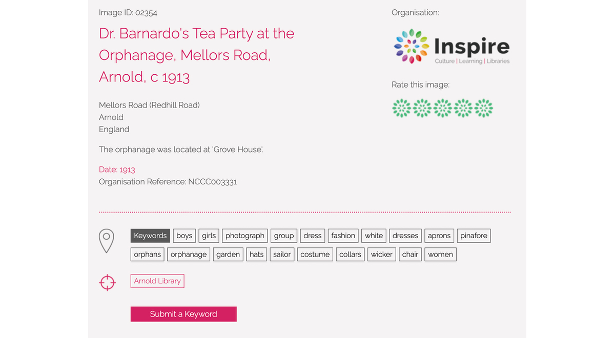 Users can submit a relevant keyword to an image. Other images can be added to this term, providing a new route for users to explore.